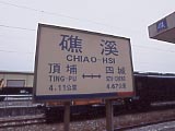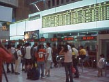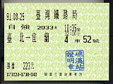 | 恐ろしくでかい「台北車站」。台北駅のこと。列車は地下から出る。 | 切符売り場。建物内の1階に島状になっている。駅の規模の割に窓口が少なく、大行列になっている。なお、ガイドなどで紹介されている窓口形態ではなかったので、案内所で希望のチケットを伝えて発売窓口を教えてもらうか、適当に列に並んでダメ元で頼んでみる。 | 台湾は列車によって、目的地別に金額が決まっている。単純明快である。 | 特急「自強」号のチケット。大きさはJRの指定券と全くといっていいほど同じ。改札は懐かしの「鋏」式。下車駅で希望すれば証明印を押して記念にくれる。なお、日付が91年になっているが、これは西暦ではなく、台湾での年号。 | 駅名表示板 | 新聞の自動販売機。新聞自身の重みで出口に落ちてくるタイプなので、薄い新聞は出てこないことがある(笑)。そのときは手を突っ込んで取る! |