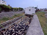 | やっと辿り着いた、礁渓温泉の共同浴場。おじぃの教えてくれた方向とは全く逆! 駅から素直に歩けば10分で来られた。 | 川がそのまま温泉になっていて、こちらは上流側。 | 建物の中を温泉の川が流れている。上流と下流に2棟あり、なぜか上流の方がぬるい。下流側に熱い湯が沸いているのかもしれない。浴槽(=川)は底が砂利だが、コケがいっぱい生えているので、浸かって動くと湯が緑に濁ってあまり気持ちよくはない。せいぜい縁で湯浴みする程度にしておくのがいい。24h無料で、混浴のようだ。だが女性はいなかった。 | 共同浴場の入口。 | 最初のおじぃに教えてもらった方向へ進んで行くと、どんどん山道になった。共同浴場は平野の中にあるはずなので、いくら何でもおかしいと思い、山道の脇に住んでいた日本語も英語も通じないおじさんに筆談で正しい場所を教えてもらった。俺が「歩いて行く。」とジェスチャーしたのに、わざわざ車で送ってくれた。謝謝! | 年代物のバイク。 |