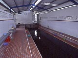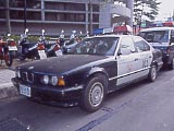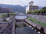 | 駅からまっすぐ来て最初の大きな交差点の左手前にある、台北市警察局北投分局。 | 路上駐車のBMWのパトカー。 | やっときました、共同浴場。站から歩いて7~8分。(2002/08) | ←2006年に行ったら、24時間営業になり、支払いがコイン式のゲートになり、個室風呂(いかがわしくないよ。)もあり、おまけに駐車場ができてた。一般浴室は60圓。 | 目立つ黄色い看板が目印。 | 浴室の写真が撮れなかったので、入口に貼ってあった浴室の案内の写真の写真で想像してね。中は脱衣所と浴室の区切りがないだけで、日本と同じだよ。浴槽は「高温池」と「低温池」がある。「池」という書き方は沖縄と同じだね。 |