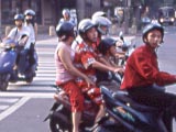 台湾北区郵政管理局の前のビルにて。気持ち悪ぅ~。カツラ屋かな? | 台湾はバイク天国で、3人4人は当たり前! みんなちゃんとメットをかぶっている。 | |