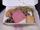 | 自強号の車内。後で気が付いたが、右の座席はカバーがないね。 | 足乗せもあり、日本のグリーン車みたい。でも、シートピッチはグリーン車ほど広くないから、グレードとしては普通車とグリーン車の中間ぐらいかな? | 車内販売のお弁当。思わず買ってしまった。60圓とメチャ安。日本でもこういうのを売ればいいのに。ワゴン(といっても簡単な物。)で売っていた小姐はすぐ空のワゴンをズルズル引いて戻ってきた。あっという間に売り切れたようだ。いいことですね。箸は「台鉄」のロゴ入りだったので使わなかった。代わりにANAの機内食で大事に取っておいた箸を使った。 | お弁当の中身。 色が毒々しいハムもステキ。盛りつけの雑さもいいね。これでいいんだよね。どうせ喰っちまうんだからさ。最後には紙の空き箱が1個だけになりました。ゴミも少ない◎。 |