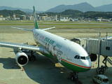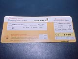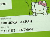 | 福岡発台北行きエバー航空2101便。 | キティジェットだそうな。 | チケットまでキティ。なんかこっ恥ずかしいな〜。 | 機内食までキティだらけ。ランチョンマットやパックのフタ、人形焼きに至るまでみんなキティキティキティ。こういう限定物は「マニア」に売れるかと、機外に持ち出せた物を現地からヤフオクに出品したけど、質問はきたものの売れなかった…。捨てて帰国しました(笑)。 | ワンコデザインの台北市街行きのバス。車体横のダルメシアンがでかすぎて洗練さに欠けるゾ。135圓。 | 革(本革かどうかまでは分からなかった)風の超豪華シート。 |