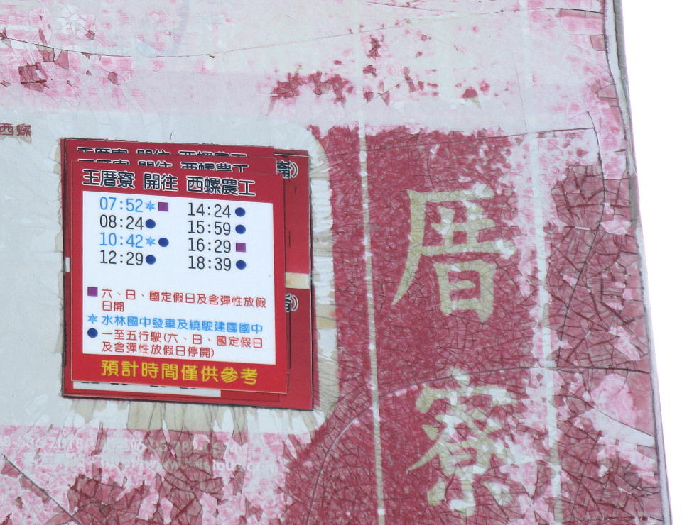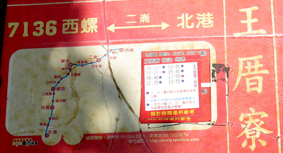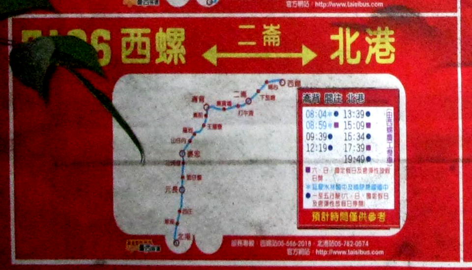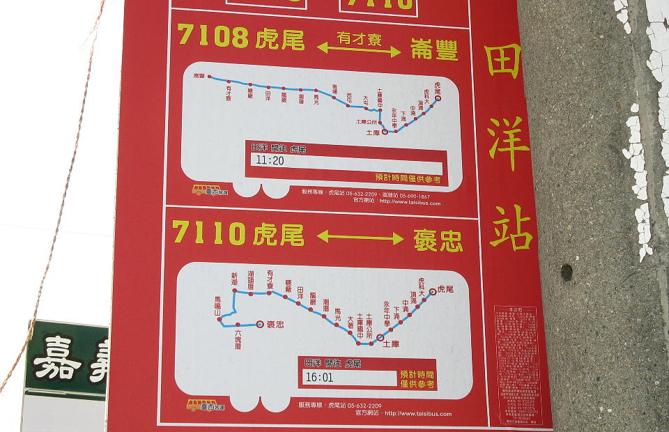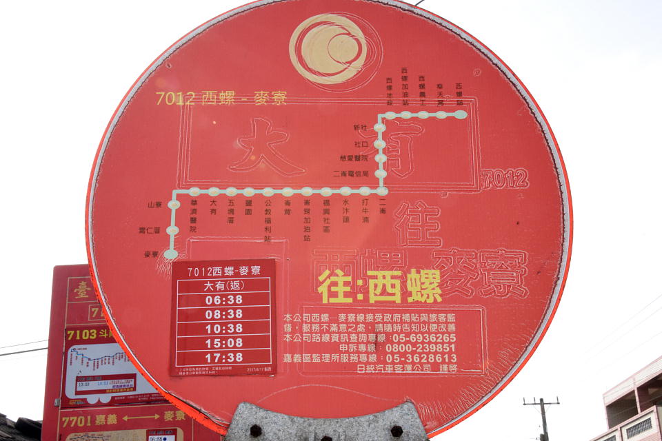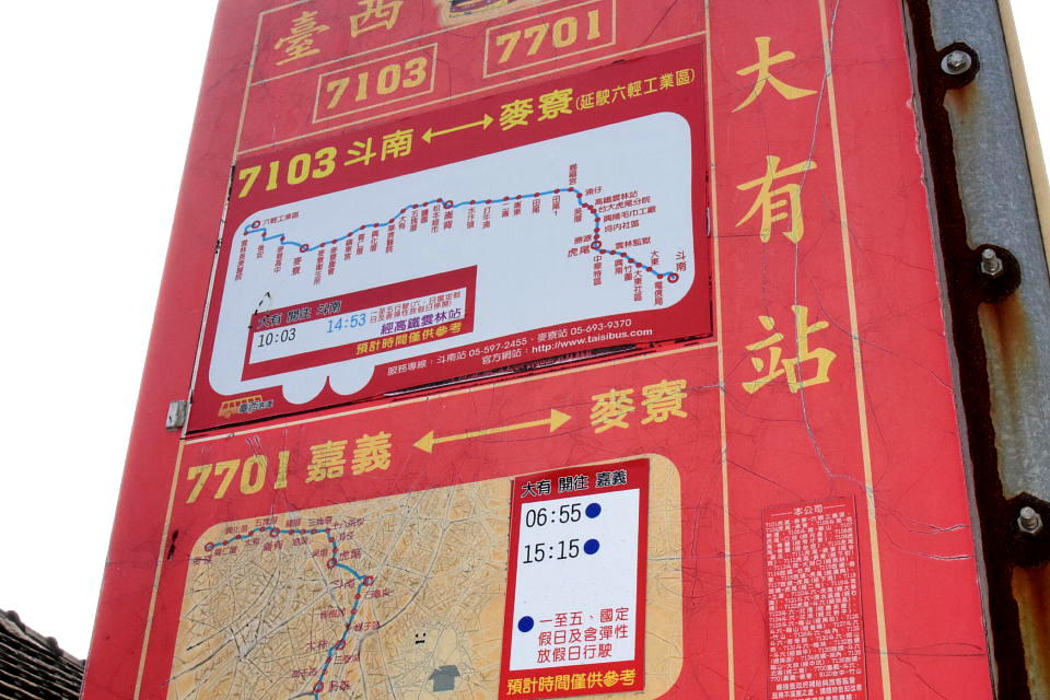 ずっと下の方にずらずらと、いろんなルートやパターンをごちゃごちゃ書いていますが、 虎尾から各装車地方面に「早く行くパターン」と、虎尾へ「遅く帰るパターン」を、先に書いておきます。 あくまでもバス利用に限ってのものですよ。 ※詳細はずっと下の方を熟読してください(笑)。 ○早く行くパターン ・平日に1便から狙う場合 ①「虎尾」06:30発の台西客運7111系統で「馬光」へ行き、そこから約2.5km歩く。 ②「虎尾」07:15発の台西客運7104系統で「崙背」へ行き、台西客運7136系統に乗り継いで「王厝寮」で降りる。 ・土休日に1便から狙う場合 ムリ!(笑)。 ○遅く帰るパターン ・バスの各最終 ①嘉義客運雲林市區公車202系統(高鐵雲林車站行き) 元長15:30~田洋15:44~龍巖15:45~潮厝15:48(土休日は+30分) ②台西客運7110系統(虎尾行き) 褒忠15:50~有才寮(16:00頃?)~田洋16:01~龍巖16:02~潮厝16:04(毎日運転) ③日統客運7012系統(西螺行き) 大有17:38発に乗って崙背へ行き、約260m歩いて戻り、台西客運7112系統に乗り継ぐ(毎日運転)。 |