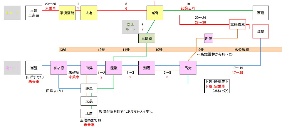 つまり虎尾での始発便以外は、そのバス停発の時刻が分かりませんし、始発からそのバス停まで何分かかるのかも分かりません!