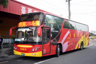| サトウキビ列車が走る虎尾行きのバス。 事前の情報では、「斗南車站前に バス乗り場がある」ということだったが、 すぐには分からず、ちょっと焦った。 何のことはない、駅舎を背にして 時計の2時方向にバスの斗南站の建物が 後ろを向いて立っているような格好で、 全く目立たなかっただけだった。 07:00発のはずが、06:45に発車した。 ダイヤ改正でもあったか? まさか15分も早発しないと思うが。 |