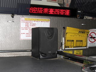 客室の最前列にスピーカーがあり、 ラジオの放送を大音量で流していたので 「やめてくれぇ」と思ったのだが、 台湾での英語講座をやっていた。 「Excuse me.は、對不起の意味です」 といった内容などだったので、 うるさいと思いつつも、 思わず聞き入ってしまった。 |