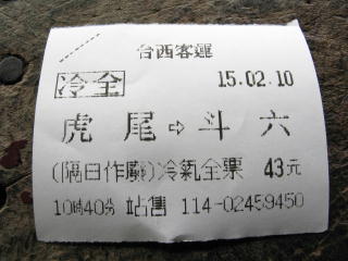 | 当初の計画では、虎尾からまた斗南 に戻ることにしていたが、 直接斗六に出る便があったので、 そちらに乗ることにした。 虎尾站には有人窓口があり、 そこでこの切符を買った。 せっかくの有人窓口なので、 ここでのきっぷが硬券だったら クラクラくるところだけど、 んなわきゃないわな。 有人=硬券なんて発想がアブナイね。 |