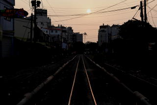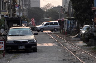 虎尾郵局からさらにそのまま進むと いよいよサトウキビ列車の踏切がある。 虎尾站からだと400mほど。 この写真は踏切付近から製糖工場 (踏切に向かって左)方向を撮影。 太陽と線路を強調させるために露出を 調整しているが、周囲は普通に明るい。 この線路の光り方だと動いていそう? |