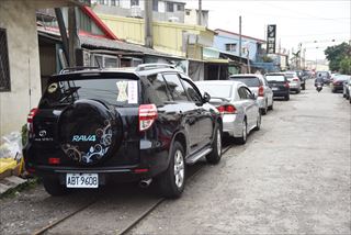 軌道上に駐車の列。 サトウキビ列車が通らなくなると こうなるんだね(笑)。 |