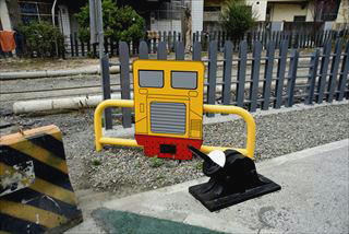 | 車止めの柵に機関車のイラスト板 が付いていたり、車止め自体が 転轍機の切り替え機 (もちろん動かない)だったり、 また、軌道との境に柵を立てたり。 この整備の様子なら、 まだしばらくは走り続けてくれるかな。 |
