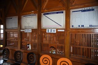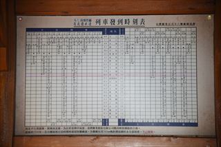 きっぷうりばの上には、 昔の製糖路線の時刻表や 路線図が掲げられている。 これは、斗六~崁頭厝線の時刻表。 |