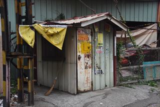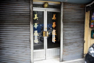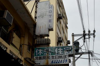 バスの「虎尾站」の割と近くで見つけた 「美華旅社」の跡。 「旅社」の文字の部分にテープが 貼られていた。 |