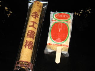 | 「虎尾站」のカフェで売っている 焼菓子とアイス。 焼菓子はクレープのように 丸く広げて焼き、固まる前に くるくると丸めてある。 パリパリと旨いが、すぐボロボロに なるので、喰い方に気をつけよう。 アイスは素朴な甘さでホッとする。 味がいくつかある。 |