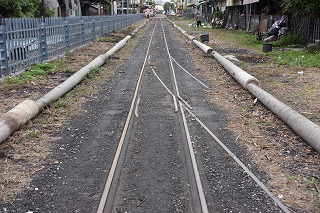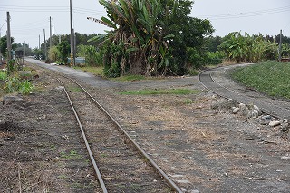 | 天気予報は雨だが、 とりあえずは降っていない。 このまま天気がもってほしい。 製糖工場の前から9号装車地へ向けて 沿線を歩き始める。 線路の両脇はコンクリ柱を敷いてある。 左側には柵が整備されている。 |