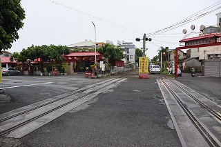 寺の敷地から南方向を撮影。 この写真で黄色信号の道を まっすぐ南下すると、約3.3kmで サトウキビ列車の平交道がある。 |