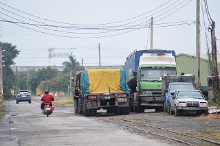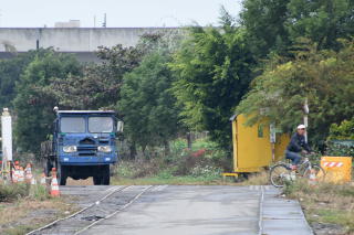 高鐵の高架(写真奥に横たうコンクリ。) が見えてきた辺りで、 線路上にどかっと停めていた トレーラーがいた。 程なく動いたからよかった。 |