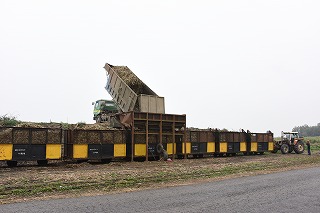 ダンプがサトウキビを落とす。 22秒の動画はこちら。 |