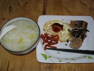 | しゃーねーからいったん宿に戻り、 宿の1階にあるメシ屋 (宿と同じ経営みたいだが、 よく見かけるただのメシ屋。)でお粥など。 あんまし旨くなかった。これで55圓。 |