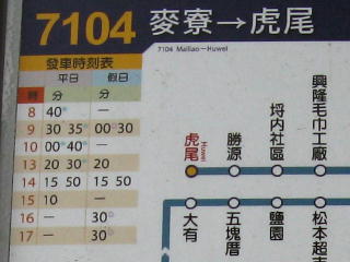 2018(平成30)年1月現在の、 大有発虎尾行7104系統の時刻表。 「●」印は、月~金運転。 「✡印は、土日運転。 虎尾からの朝早い便はないので、 朝いちから取材したい場合は、 タクシーで馬公厝線沿線まで来て、 取材後にのんびりバスで帰る ってのがいいんじゃないかな。 |