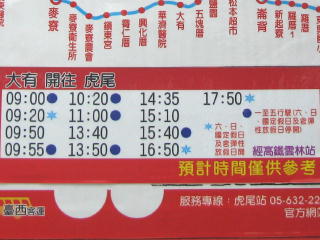 虎尾のバス停には、 虎尾終点にもかかわらず、 「發車時刻」が書かれているが、 どうやらこれは、始発の発車時刻 のようだった。 というのは、 ①大有のバス停の時刻と突合せ ②台西客運の公式サイトで確認 をしてみると、15:10を除き 全てこの時刻の20分後が大有の 時刻だったからだ。 ちなみに15:10の便は、 大有は30分後だった。 台西客運のサイトでは15:20に なっているので、この写真の時刻は 改正前のものと思われる。 |