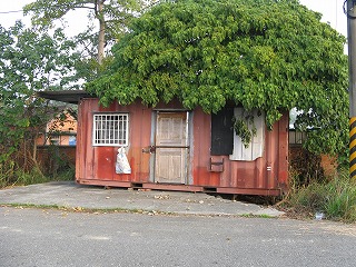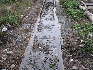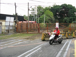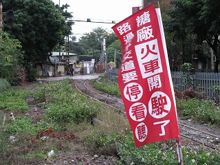 製糖工場のところの平交道に来て、 踏切番(平交道番)のおじさんに 今日の運行はあるかと聞いたら、 「没有」だった。 いつまで「没有」なのかも聞いたが 分からないとのことだった。 線路はさび、昨日の雨の 水たまりができている。 でも、「没有」なのになんで製糖工場への 門が開いていておじさんがいるのかな と思ったら、この平交道から 少しはみ出してしまう貨物の入れ替え のためだった。 |