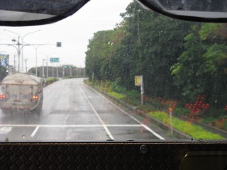 | 10號での取材を終え、 西(=11號方面)に歩くと約7分で 省道台19線の平交道に出る。 ここから南下して潮厝を目指す。 この平交道から11號が見えるよ。 ダンプがスタンバってる。 |