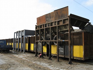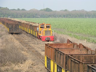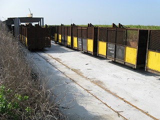 | サトウキビをてんこ盛りにした貨車が 2便の到着を待っていた。 |