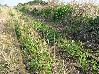 線路の間に生える10cmぐらいの草。 これが朝露や雨で濡れたときに ここを歩くと靴やズボンの裾が グショグショになる。 |