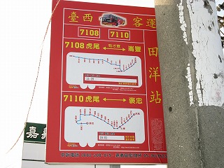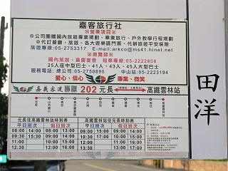 と、ここでとんでもないものを 見つけた! 嘉義客運が 元長~高鐵雲林のバスを 走らせているのか? こんな情報知らないゾ。 宿に帰ったら早速ネットで調べよう。 →この約半月後から走らせる 新路線ということが分かった。 詳しくは、基本情報のページを見てね。 |