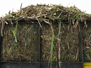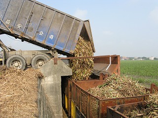 ダンプが割と頻繁にやってきて 次々にサトウキビを落とす。 |