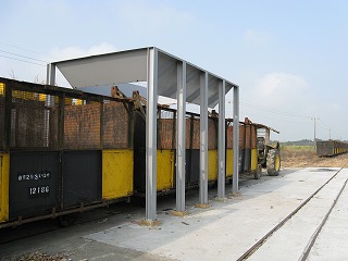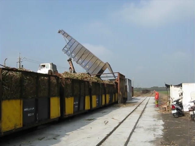 | 2便の発車後はまた空車がセットされ、ダンプがサトウキビを貨車に落とす。 積み込み後、1両分だけ貨車を移動させる約54秒の動画はこちら。 |