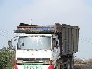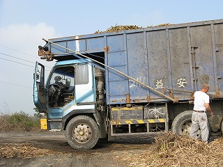 | ダンプが到着し、サトウキビを落とす準備。 | ダンプには、走行中にサトウキビが飛ばないように 可動式の幌が付いているが、 これを使っている運転手をほとんど見たことがない。 たまに幌をかけたり外したりしているのを 見るものの、そういうときに限ってカメラを 準備していないんだね。 動画で撮影したいな~と前から思っている。 |