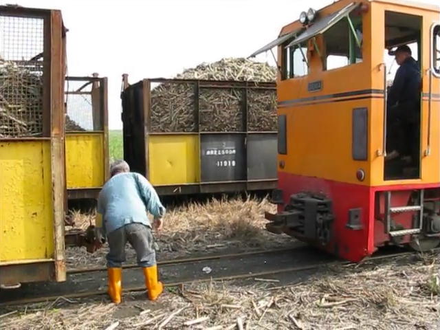 | 一旦停車し、DLを切り離して側線に入り、これまで積み込んだ貨車に連結して引っ張り出す。 その様子の約40秒の動画はこちら。 引っ張り出した貨車を今度は推進でこれまでの貨車の前方に連結して、 10:06に9號~製糖工場に向けて発車していった。 |