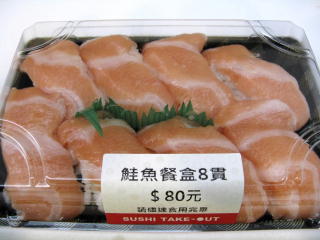| 台湾に着いてから、 七堵~樹林間を軽く取材しているときに、 樹林車站のコンコースの持ち帰り鮨屋で 買ったサーモン握り。 サーモンは悪くなかったが、 コメが固くてパサパサしていたのが残念。 |
