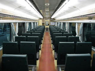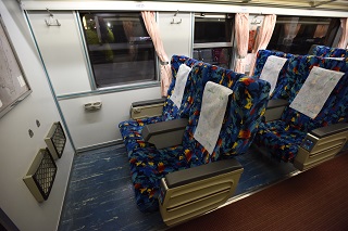 ほどなく室内灯が点いた。 ビニール張りだが、 進行方向に向いたシートが並ぶ。 |