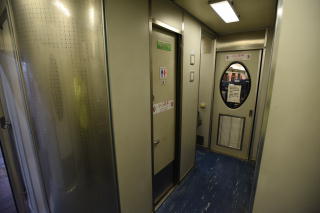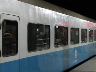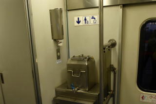 | 天井の照明の脇に空調の吹出口が細かく 設置されているが、手が届かないし、 「触るな」と書いてあるんで、いじれない。 この日は気温が11~13℃と結構寒く、 他の列車は暖房が入っていたが、 この夜行は暖房がなく、寒い寒い。 日本から着てきたスキーウェアをかけて、 呑みながら寝ていたらゲリした。 さっきのトイレに何回も駆け込んだ…。 |