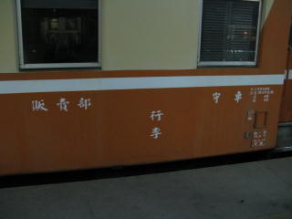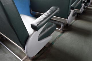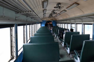 | シートには肘掛けが付いている。 | 天井には扇風機。 | 傾いているサボがステキ。 ん? サボ本体は傾いているけど、 文字は傾いていないね。 あ、サボに文字が傾いて 書かれているんだ(笑)。 |