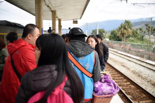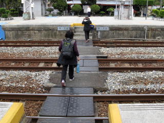| 彰化から海線に乗り、 隣の追分に来た。 改札口とホームとの行き来に線路を渡る。 日本でも昔見た光景。 |