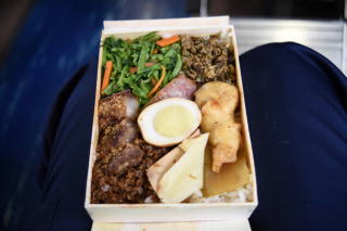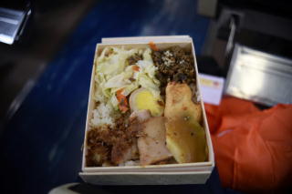 臺鐵便當。60圓。 太魯閣號がデザインされているが、 掛け紙方式ではなく、 箱に直接印刷されているので、 持ち帰りはなかなか難しい。 次回は蓋の部分だけでも切り取って 持って帰ってくるか…。 |