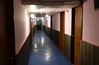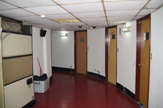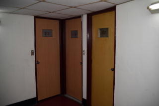 フロントの左側の階段で2階に上がった。 ビルが丸いので、廊下も曲がっている。 |