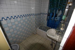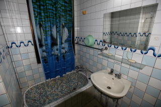バスタブは小さく、タイル張りで、 しかも内側が丸っこい造りでおもしろい。 ちゃんと熱いお湯が出たよ。 奥に掛かっているシャワーカーテンは 窓のカーテン代わり。 バスルームに窓があるのは珍しいね。 |