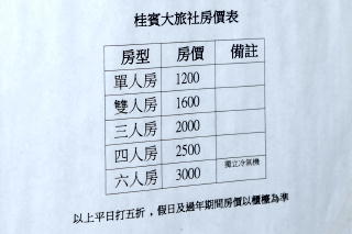 入口のドアの内側には 部屋の料金表が貼ってあった。 俺が泊まった平日は600圓だったから、 休日や年末年始は1200圓てこと。 観光宿ではないのに、 平日の方が安いんだね。 |