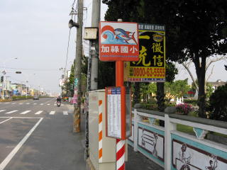 | 加祿車站を背にして直進し、 信号を右折して約100mぐらいのところに 「加祿國小」のバス停がある。 この道路は制限速度が60km/hなので、 クルマがビュンビュン通って行く。 騒音が結構でかい。 日本の感覚では左側に写っている道路の 向こう側からバスが来そうな気になるが、 台湾は右側通行なので、 実際はこの写真の後ろからバスが来る。 慣れないと違和感がある。 |