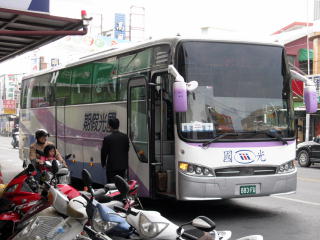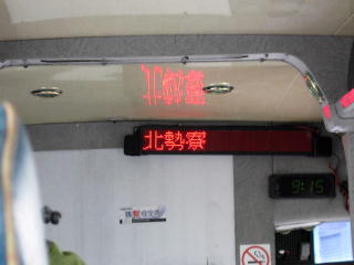 バスは、複数系統あるが、 日中は大体30分毎にあるようだ。 枋寮車站まで行きたいので、 本来乗る予定の時刻より早く来た バスの運転手に「有往枋寮嗎? (ようわんふぁんりゃおま)」と聞いたら、 「OK」と言ったので、安心して乗れた。 運賃は先払いで26圓。ワンマンなので、 降りるときは「降車ボタン」を押す。 ちなみにこのバスでは、 座席上のエアコンの吹き出し口のそばの 「下車鈴(赤いヤツ)」を押す。 この「下車鈴」って書いてあるシールは コクヨかなんかの「見出し」だった。 |