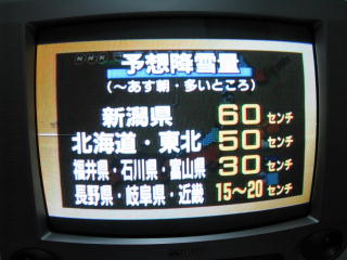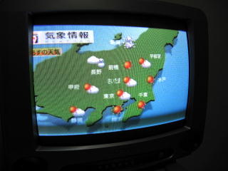 | テレビは懐かしのブラウン管。 台湾の有線放送がたくさん見られるが、 その中にNHK総合のチャンネルもあった。 その他日本の民放が2局ほど確認できた。 長野は雪みたい…。 新潟は吹雪だ~。 |