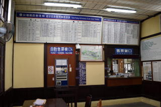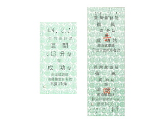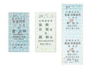 | ホームから見た日南車站の駅舎。 | 日南でGETした硬券の一部。 1番左の台北までのものは、 かなり昔の券のようだ。 |