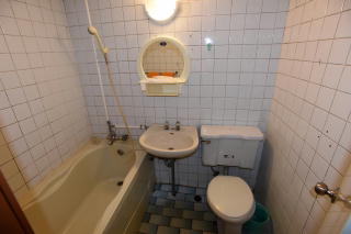 | ユニットバス。 だいぶ疲れてはいるが それぞれの機能はちゃんと果たす。 ただ、天井は崩落の不安が ないとはいえない。 |