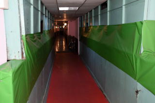| ビルとビルの間をつなぐ渡り廊下。 緑のシート状のテープが鮮やかだね! と書けば素晴らしそうだが、 こりゃ驚いた。 |