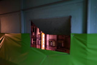 事前の情報では、カーテンは 「鎧」のようなタイプだったが、 このクルマは、日本でもよくある 引き下ろしタイプの布カーテンだった。 |