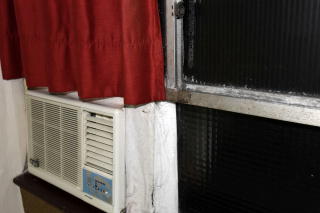窓に埋め込まれているクーラー。 暑くはなかったので作動させなかった。 埋め込み部のパテ盛りなど、痛々しい。 俺は気にしないけど。 |
